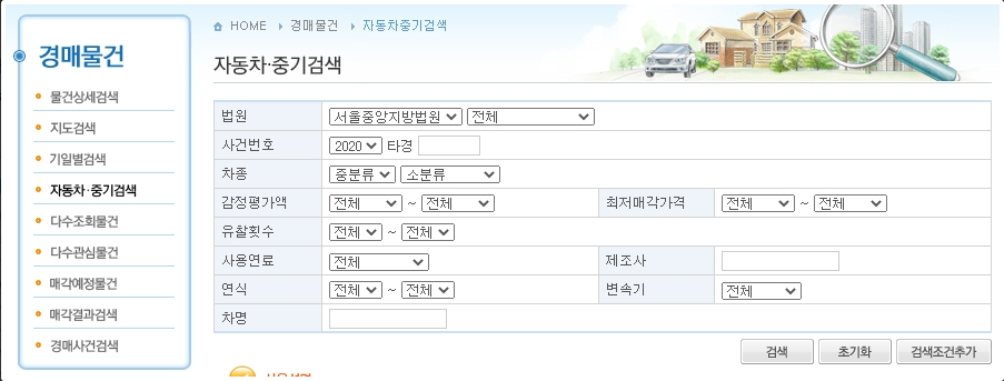 감정가액, 자동차종류, 생산년도 등과 해당지역의 법원을 선택해주시면, 보다 쉽게 확인할 수 있습니다. 만약, 본인이 원하시는 차량이 다른 지역에서 경매가 진행되고 있다면 그곳으로 가야하는 번거로움이 있겠습니다. 또한, 유찰이 많은 차량일수록 가격은 내려가기 때문에 보다 더욱 저렴한 가격에 매입이 가능하겠습니다.
