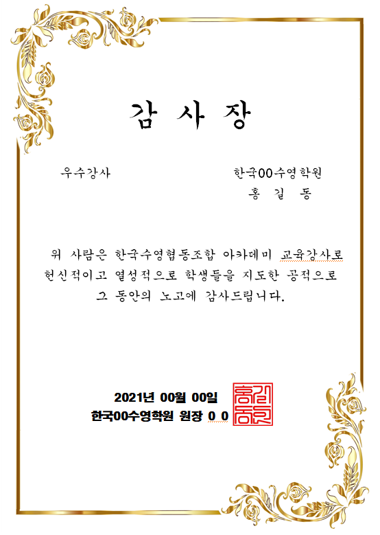 반응형그리고 감사장에 가운데 부분에는 어떠한 이유로 감사장을 수여하는지의 대한 상세 내용을 작성하여 줍니다. 위에 사진에서 알 수 있듯이 '위 사람은 한국수영협동조합 아카데미 교육강사로 헌신적이고 열성적으로 학생들을 지도한 공적으로 그 동안의 노고에 감사드립니다.' 이러한 양식으로 작성하여 주시면 되겠습니다. 마지막으로 감사장을 수여한 날짜를 기록하여 주시면 되겠습니다.