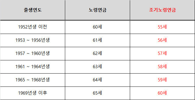 위 표에서 보시면 알 수 있듯이, 1952년생 이전에 출생하신 분들께서는 60세부터 연금수령이 가능하며, 1969년생 이후에 출생하신 분들께서는 65세부터 연금수령이 가능합니다. 생각보다 많은 분들께서 모두 동일한 나이에 연금을 수령할 수 있다고 알고 있으시지만, 실제로는 출생연도에 따라서 조금씩 연금을 수령할 수 있는 나이가 달라진다는 것을 확인할 수 있습니다. 그렇다면 조기노령연금이란 무엇일까요?