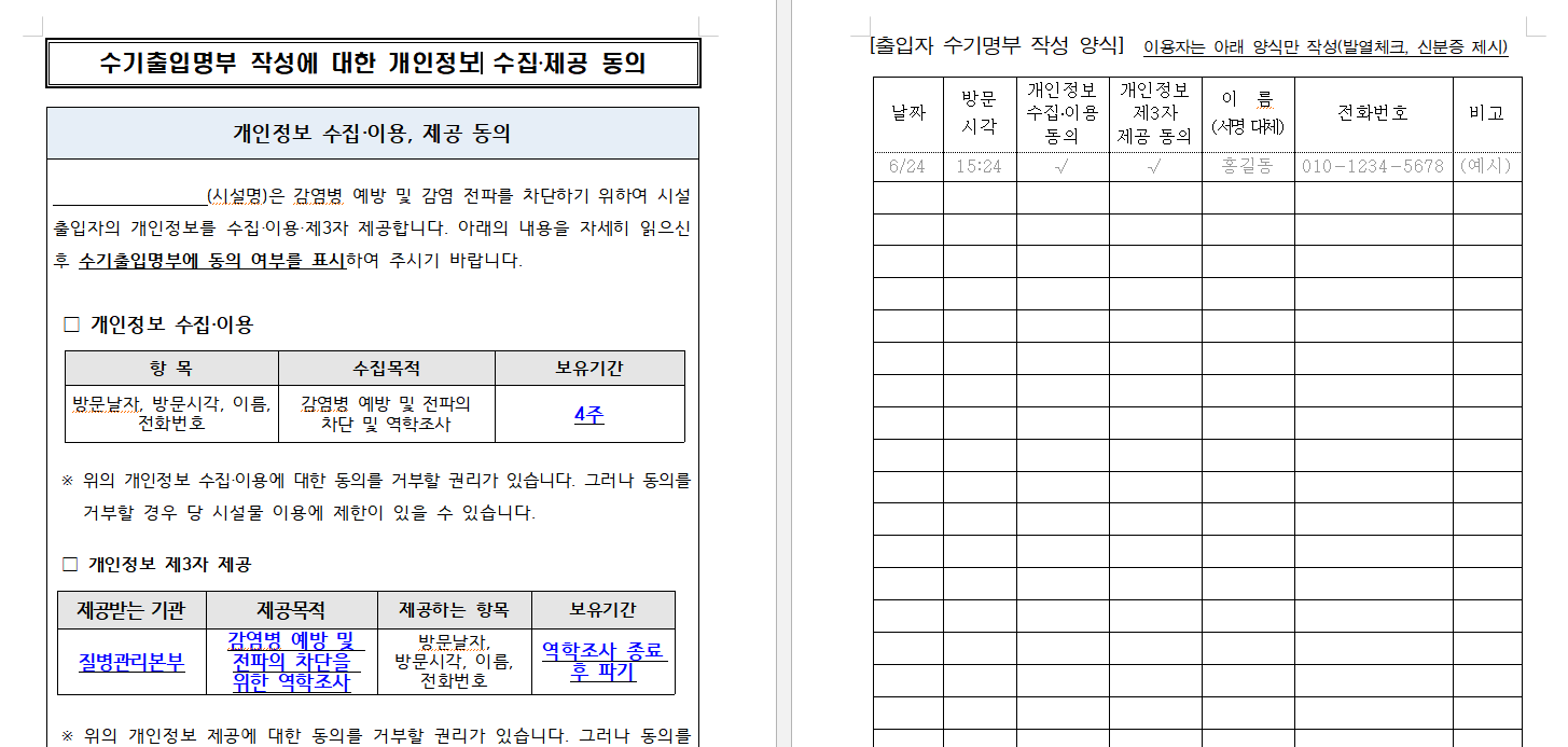 - 수기명부에 기재 된 개인정보에 대한 관리책임은 시설관리자 본인에게 있으며, 개인정보가 유출되지 않도록 관리책임을 다하여야 함