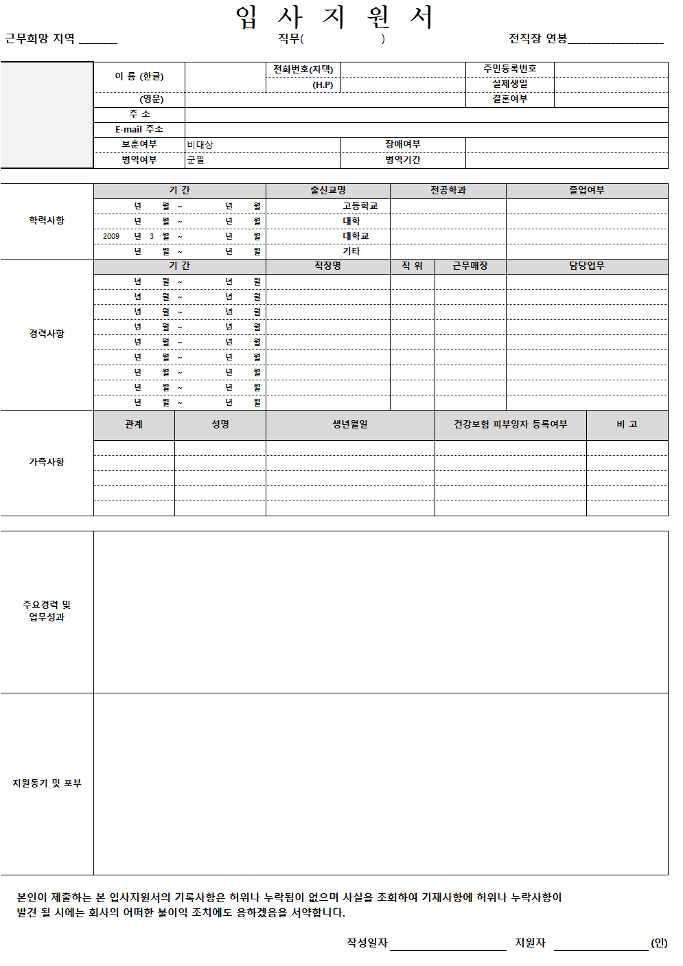 반응형추가로 본인의 학력사항과 경력사항, 가족사항 등을 기입하여 주며 마지막으로 주요경력 및 업무성과와 지원동기 및 포부 등을 기입하여 주면 입사지원서 작성이 마무리 되겠습니다. 특히 주요경력 및 업무성과나 지원동기 및 포부는 보다 상세하게 기입해 주셔야 합니다.