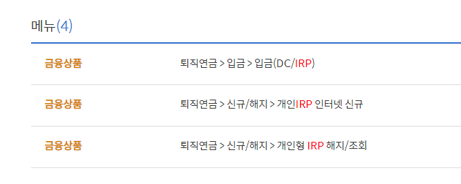 2. 메뉴 → 금융상품 → 퇴직연금>신규/해지>개인>IRP인터넷 신규 클릭