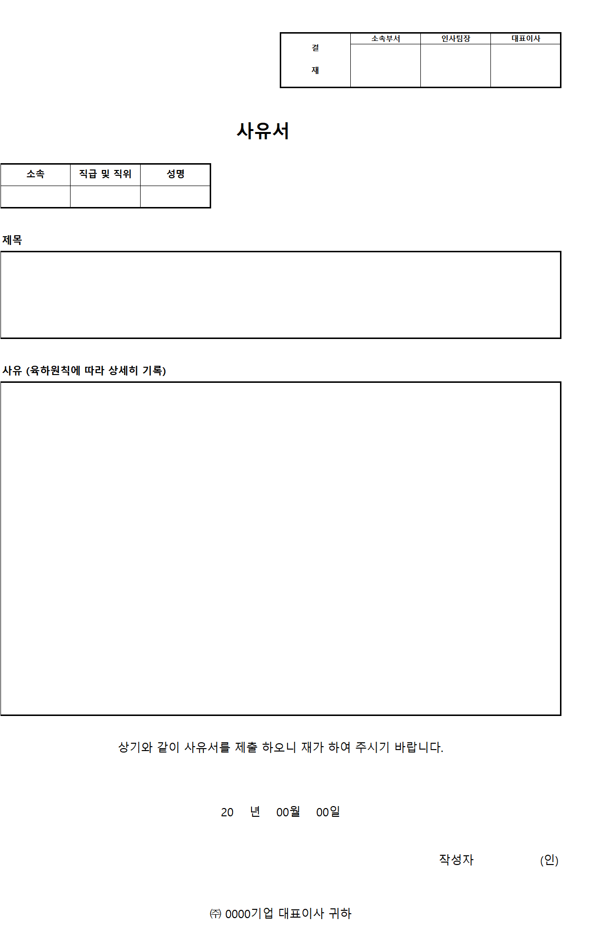 일반적으로 회사나 학교와 같은 기관에서 많이 사용되는 문서중에 하나 입니다. 사유서에는 사건이 발생한 현황과 그 원인 및 기타 사유에 대해 상세하게 기재하여야 하며, 향후 어떻게 개선해 나갈 것인지의 대한 내용도 추가 되어야 합니다.