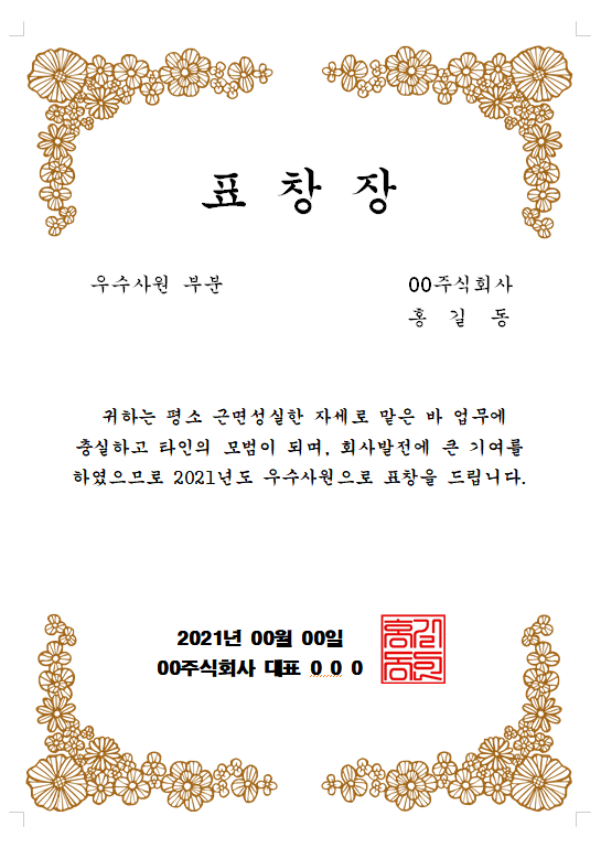 귀하는 평소 근면성실한 자세로 맡은 바 업무에 충실하고 타인의 모범이 되며, 회사 발전에 많은 기여를 하였으므로 2021년도 우수사원으로 표창을 드립니다. 2021년 00월 00일, 0000주식회사, 대표이사 홍길동.