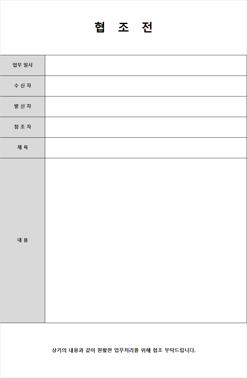 안녕하세요 오늘은 업무 협조전 양식을 무료 다운로드 하실 수 있도록 공유해 드리려고 합니다. 협조전이란 무엇일까요? 협조전이란 영어로는 disposition form이라고 하며 상대방에게 업무상 일정한 사항을 요청, 즉 협조를 구할때 작성하며 특정 업무에 대하여 의사결정권자가 결재하고 지정한 사항에 관하여 관련 회사 (부서)간 의견교환과 협조를 얻는데 사용하는 문서를 말합니다. 행정부서, 부속기관 등 회사에서 어떤 업무를 시행하고자 할 때 해당 업무 시행 전에 관련 부서의 업무협조를 받아야 하는데 이 경우 업무 협조 요청을 받은 부서는 해당 업무가 효율적으로 수행될 수 있도록 적극 협조해야 합니다.