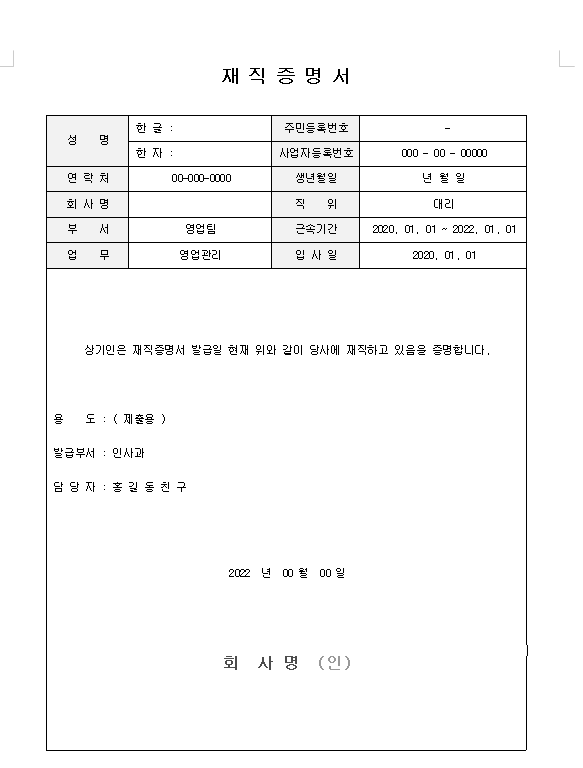 따라서 이런경우에 재직증명서를 따로 만들지 않아도 편하게 언제든지 사용할 수 있도록 준비해봤습니다.