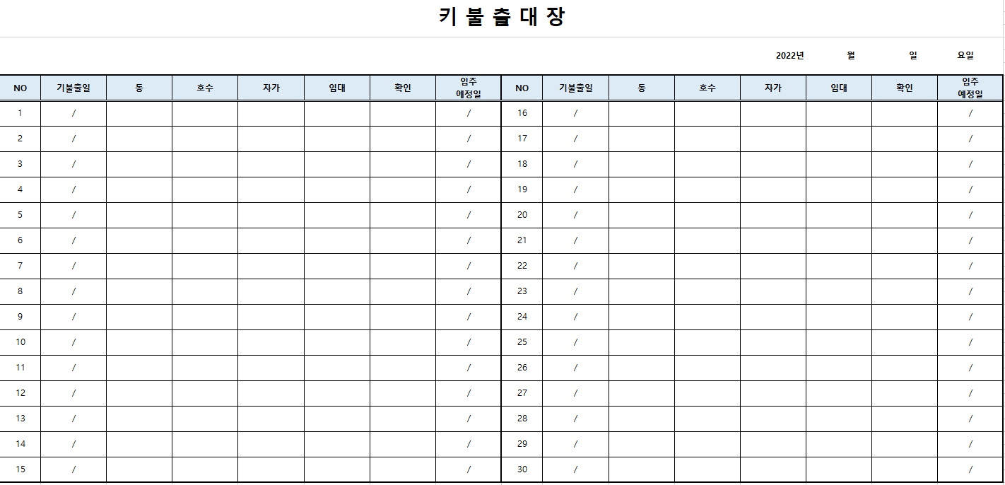 저는 오늘 불출대장 양식 중에서 아파트 입주시에 가장 많이 사용 되는 키 불출대장 양식을 작성하여 가지고 왔습니다. 일반적으로 신축 아파트 입주시 작성하는 서류 양식중에 하나가 되겠는데요, 관리비 예치금 납부가 확인되면 입주신청서를 작성하고 아파트 각종 키 (열쇠)등을 수령하였다는 내용의 키 불출대장을 작성하게 됩니다. 사실 아파트 입주뿐만 아니라, 오피스텔 및 상가 계약시에도 자주 사용되는 양식중에 하나이기 때문에 필요하신 분들께서는 반드시 무료 다운로드 하셔서 사용해 주시면 감사하겠습니다.