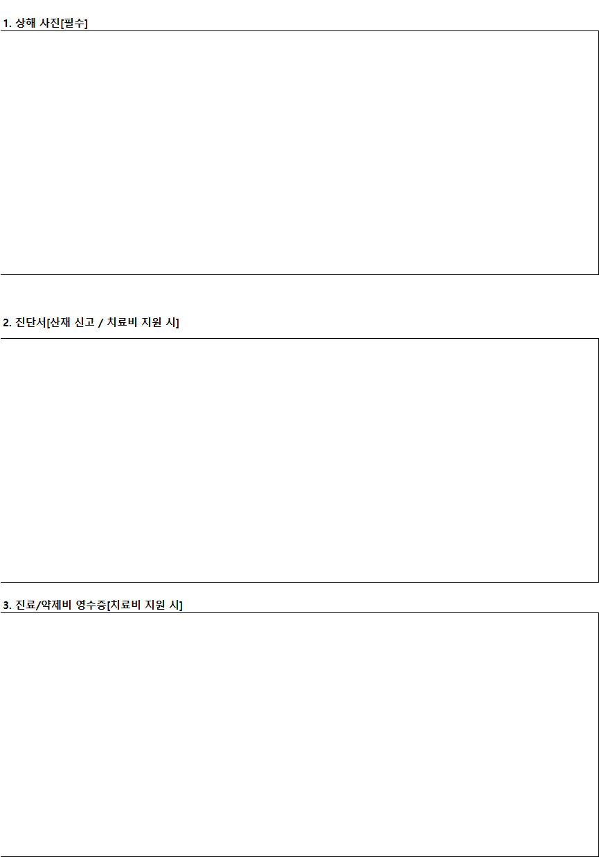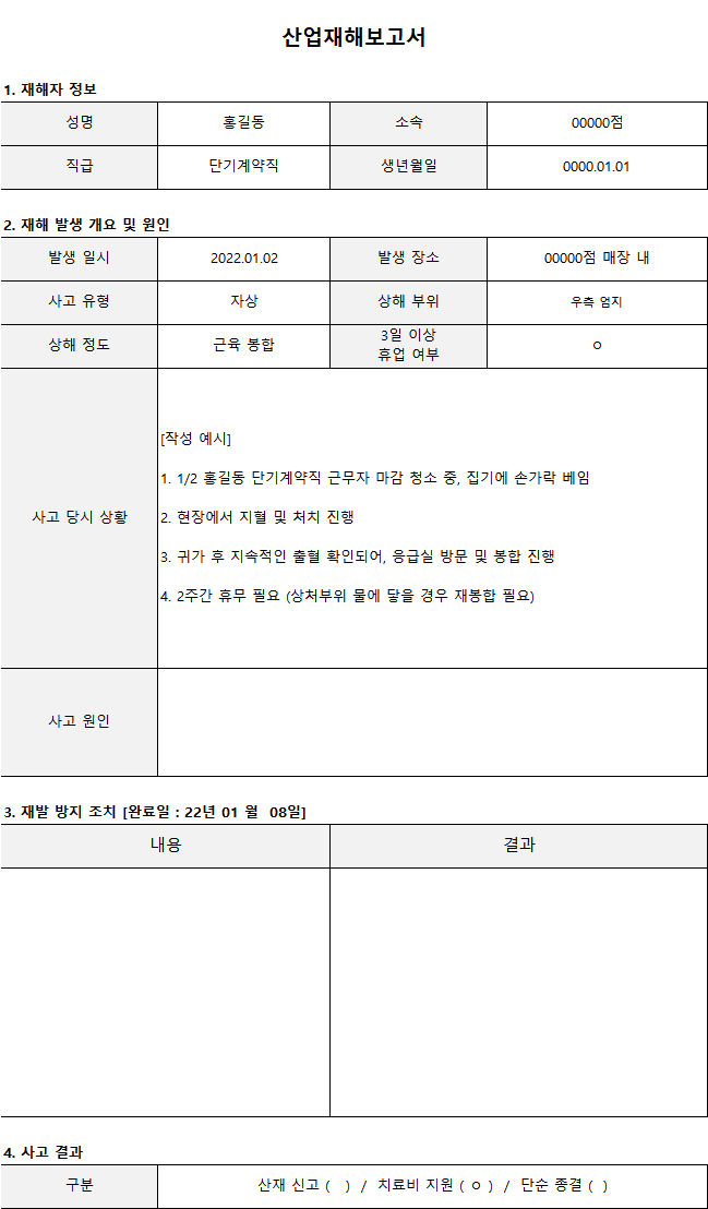 ④ 재해자의 상해사진, 진단서, 진료/약제비 영수증을 수취하여 증빙 자료를 남겨놓는 것이 좋습니다.※ 산업재해보고서 (사건보고서) 양식 무료 다운로드 방법