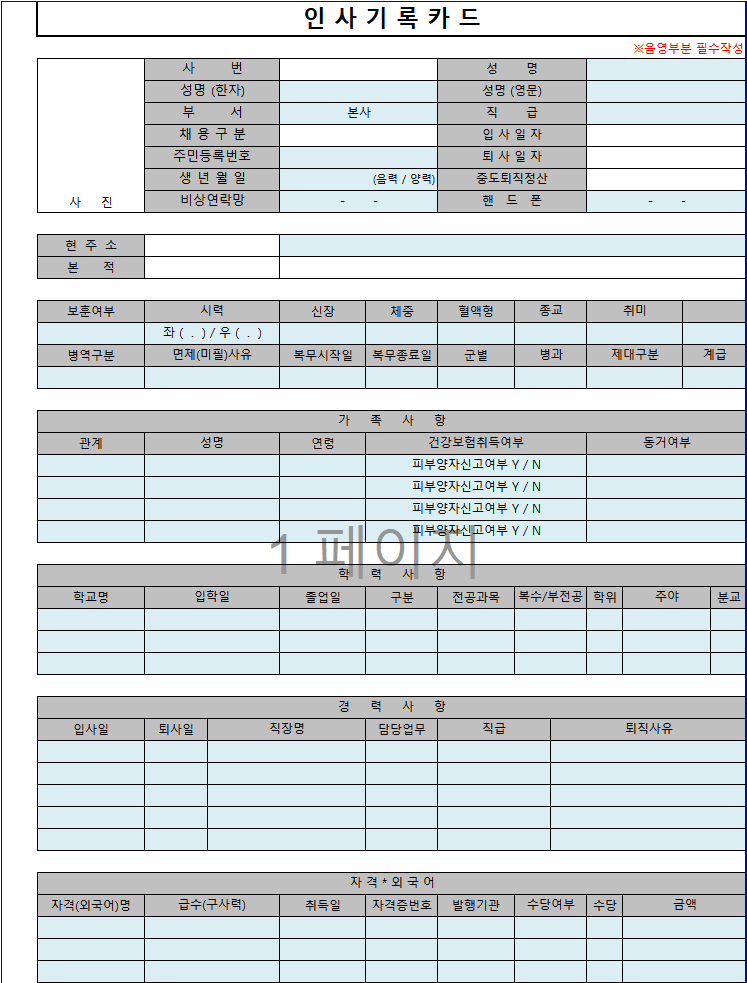 * 인사기록카드 양식 무료 다운로드 방법