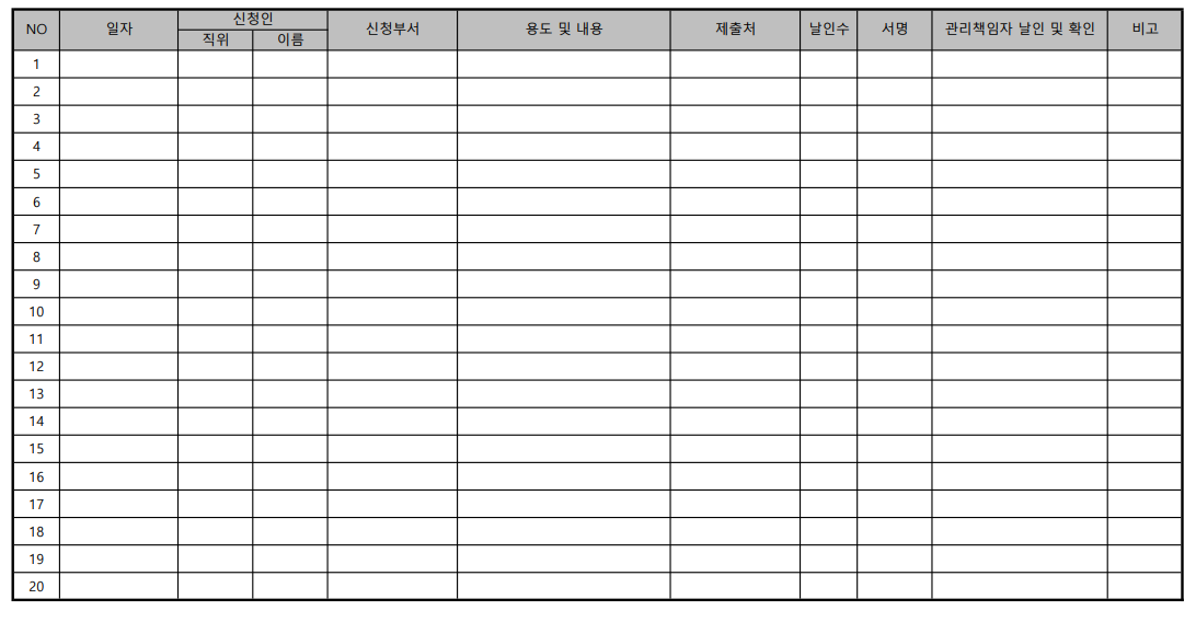 안녕하세요 오늘은 기업에서 많이 사용되는 양식중에 하나인 사용인감대장 양식을 무료로 다운로드 하실 수 있도록 공유해 드리려고 합니다. 사용인감대장이란 무엇일까요? 사용인감대장이란 법인으로 운영중인 회사의 중요 문서를 결재하거나 계약 등을 진행하고자 할 때 사용되는 사용인감도장을 사용하는 경우, 그 사용 기록을 남겨놓는 문서라고 보시면 될 것 같습니다. (참고로, 사용인감도장이란 회사의 결정사항과 관련하여 날인을 진행하는 경우 사용하는 도장을 뜻합니다.)