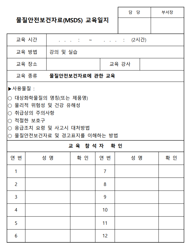 MDSD (물질안전보건자료)를 취급하려는 사업주는 반드시 물질안전보건자료에 대한 대상 물질을 양도 및 제공하는 자로부터 제공받은 물질안전보건자료를 작업장에 게시 및 비치해야 하며 취급하는 근로자에게 반드시 교육을 실시하여야 합니다. 또한 교육을 진행하였다면 교육시간 및 교육내용 등을 기록하고 보관하여야 합니다. 교육일자와 시간을 작성하고, 교육을 받은 근무자에 성함과 서명을 같이 기록하여 보관해 놓으면 되겠습니다.