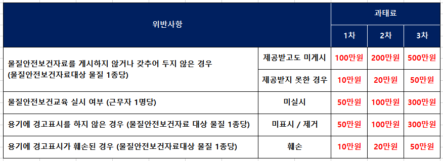 우리나라에서는 산업안전보건법 제41조 및 동법 시행규칙 제92조에 의거하여 MSDS 제도를 운영하고 있으며, 사업주는 근로자에게 유해하거나 위험한 화학물질 또는 물리적인자 등을 제조·수입·사용·운반 또는 저장하고자 할 경우 해당 물질의 명칭과 함유량, 응급조치요령, 폭발·화재 시 대처방법 등 16가지 항목을 기재한 MSDS를 작성하여 제공해야 합니다. 또한 이를 고용노동부장관에게 제출하여야 하며, 미제출시 500만원 이하의 과태료가 부과됩니다.