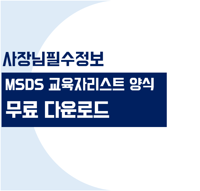 안녕하세요 오늘은 위험물질을 보관하는 사업장에서 반드시 구비하고 있어야 하는 MSDS (물질안전보건자료)의 대한 근무자 교육 진행 여부를 확인할 수 있는 MSDS 교육자리스트 양식을 무료로 다운로드 하실 수 있도록 공유해 드리려고 합니다. 물질안전보건자료(MSDS)란 화학물질의 안전한 사용을 위한 설명서라고 보시면 됩니다.