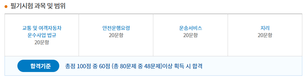 (시험과목은 교통 및 여객자동차 운수사업 법규, 안전운행요령, 운송서비스, 지리의 관한 문항으로 총 80문항으로 구성되어져 있습니다. 이 중 48문항을 맞아야 합격하실 수 있습니다)