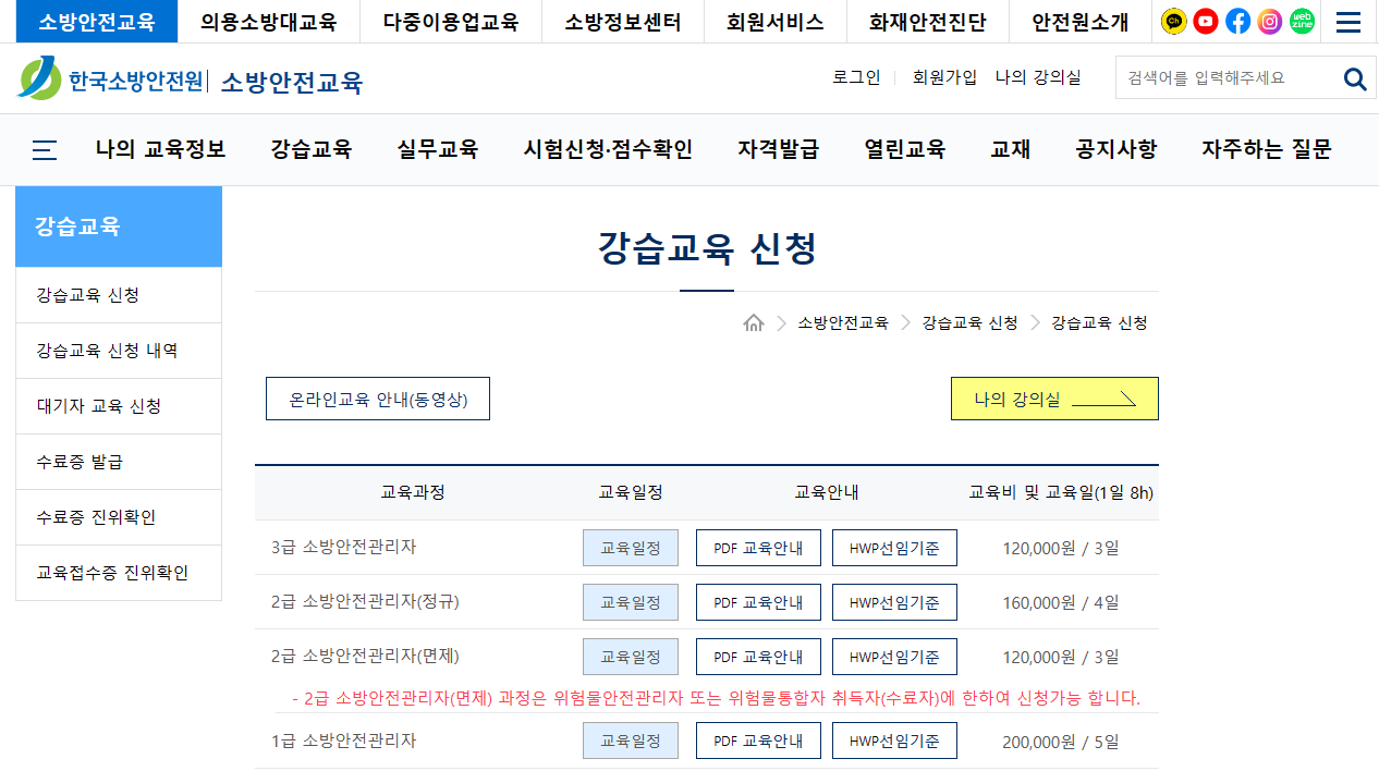 소방안전관리자 강습교육이란 한국소방안전원에서 시행하는 교육으로써, 소방안전관리자 1,2,3급, 특급에 응시하기 위해서는 기본적으로 이 강습교육을 이수해야 해당 시험에 응시자격을 얻을 수 있기 때문에 필수적으로 이행해야 하는 교육과정입니다. 해당 교육과정을 이수하게 되면 해당 경력이 없어도 시험에 응시할 수가 있습니다.
