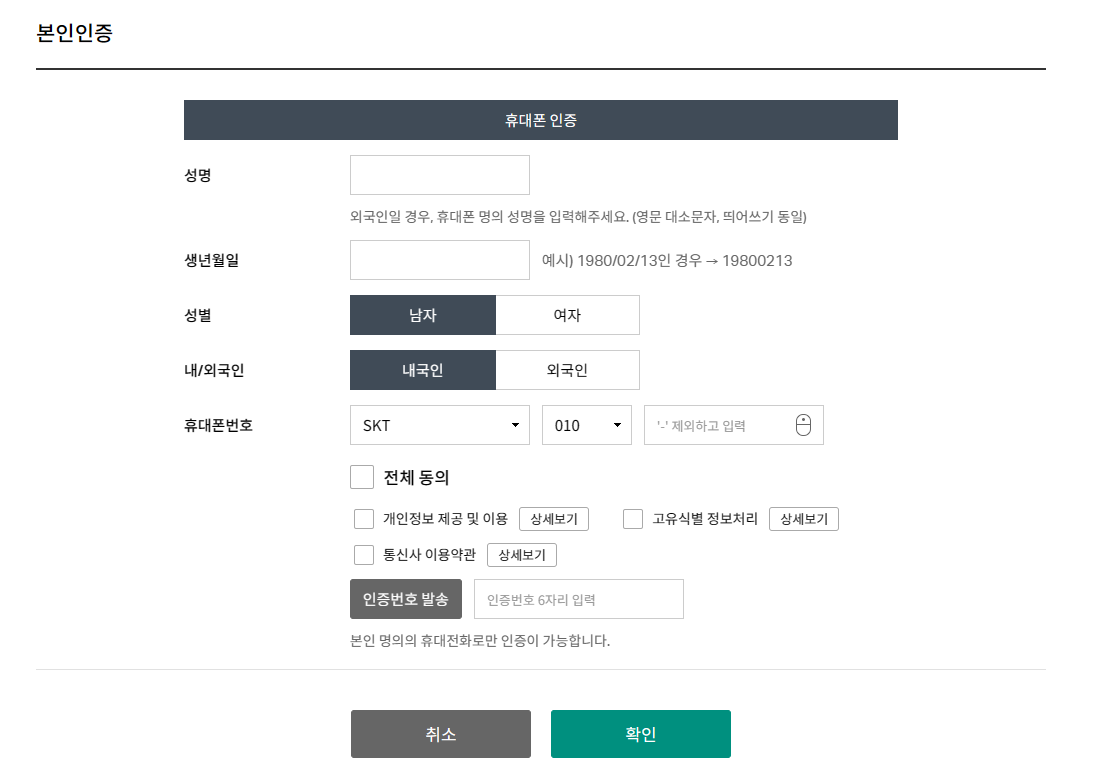 넷째, 본인인증 (휴대폰 인증)을 진행하면 비밀번호 등록/변경이 마무리 됩니다