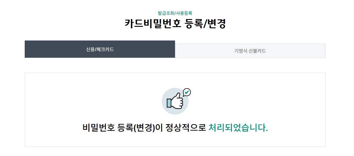 신규비밀번호를 기입하여 카드 비밀번호 등록/변경을 진행합니다