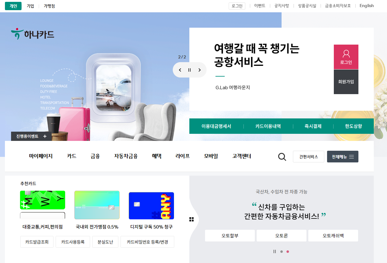 첫째, 하나카드 홈페이지로 접속을 해줍니다