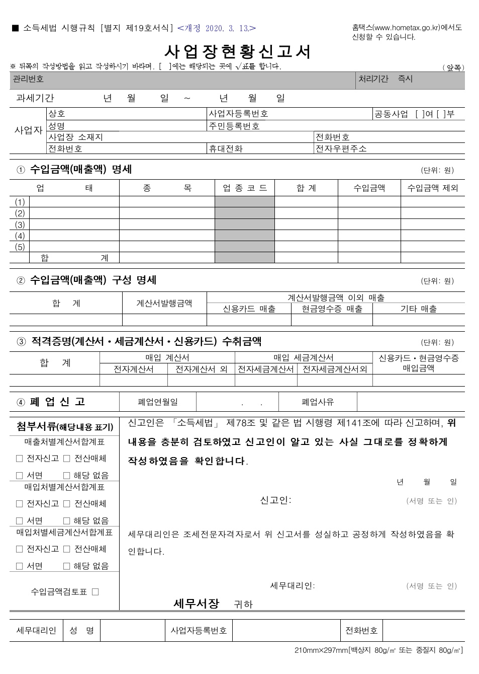 사업자현황신고란 부가가치세가 면세되는 개인사업자가 직전년도의 수입금액 및 사업장 현황을 다음 해 1월 1일부터 2월 10일까지 관할세무서에 신고하는 것을 말합니다. 참고로, 신고기간 내에 신고하지 않을 경우 가산세를 내야하기 때문에 반드시 기간 내에 신고하시는 것을 추천드립니다.