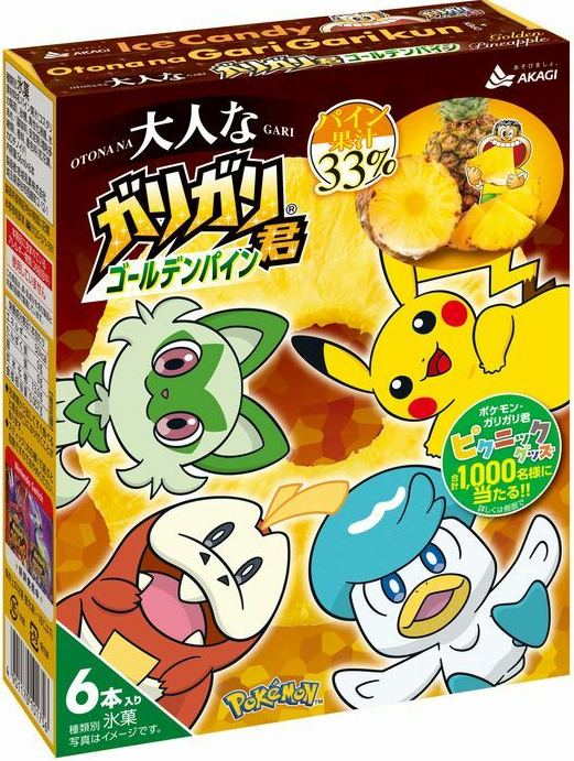 아카기유업은 5월 하순, 포켓몬 패키지의 「어른스러운 가리가리군 골든 파인(6개입)」을 전국 발매한다. 수량 한정. 56ml × 6병이며, 세금 포함 410엔. 종류별로는 빙과.