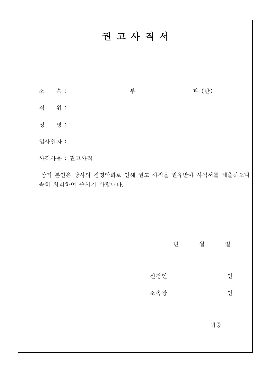 정확한 날짜와 개인 정보 기재: 권고사직 통지 일, 퇴직 일자, 부서 및 직책, 이름 등 개인 정보를 정확하게 기재합니다.