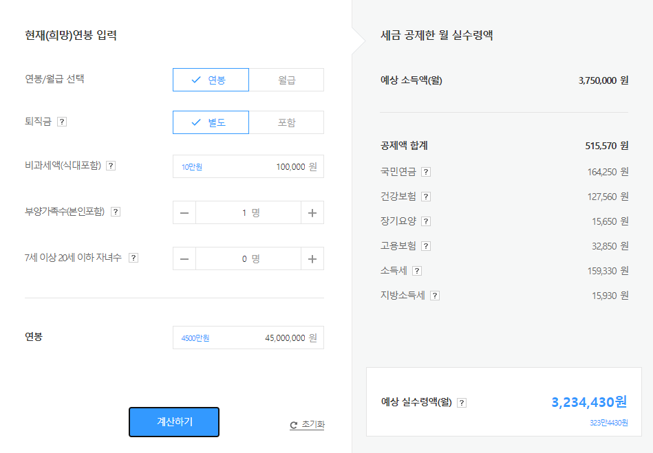 연봉 4500인 경우 국민연금 164,250원, 건강보험 127,560원, 장기요양보험 15,650원, 고용보험 32,850원, 소득세 159,330원, 지방소득세 15,930원을 공제한 세후 금액인 3,234,430원을 매월 급여로 지급받게 됩니다. 즉 연봉 4500의 세후 실수령액은 38,813,160원입니다. 약 3900만원 정도 됩니다. (월 323만원)