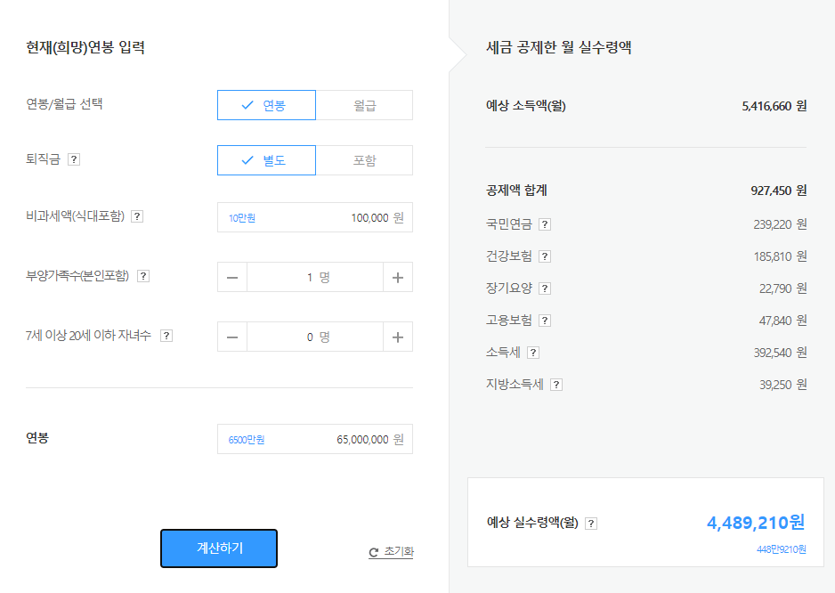 즉 연봉 6500의 세후 실수령액은 53,870,520원입니다. 약 5400만원 정도 됩니다. (월 448만원)
