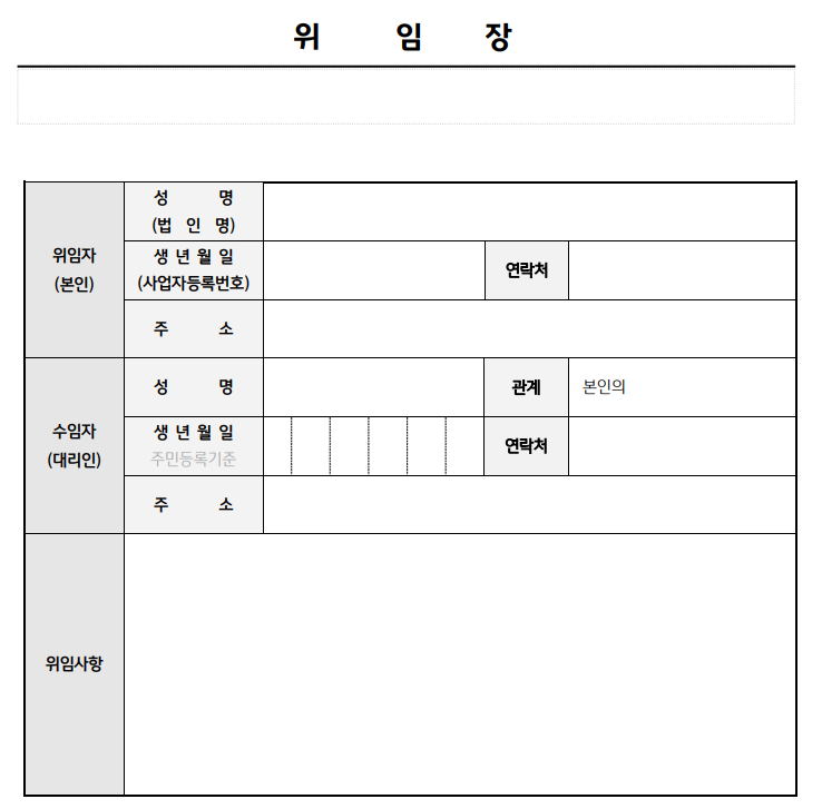 - 위임 받는 사람(대리인)의 정보: 성명, 주민등록번호, 전화번호, 주소