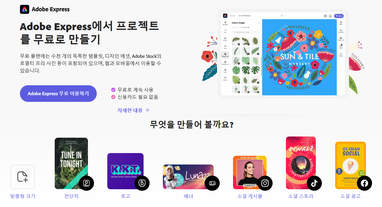 두번째로 소개해 드릴 무료 사이트는 Adobe Express (어도비익스프레스) 입니다. 저는 전문 포토그래퍼나 영상제작자가 아니기때문에 간단한 편집작업 위주로 하고 있습니다. 그래서 굳이 비싼 유료버전보다는 무료 버전인 Expresss 를 이용중입니다. 하지만 조금더 고급기능을 원하시는 분이라면 Pro 로 업그레이드 하시는것도 추천드립니다.