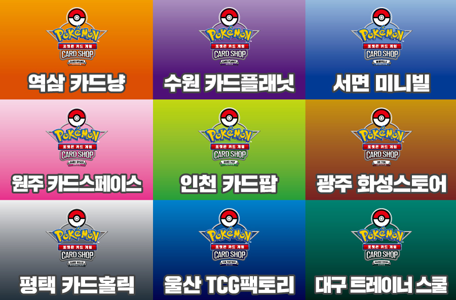 광주 화성스토어, 평택 카드홀릭, 울산 TCG팩토리, 대구 트레이너 스쿨