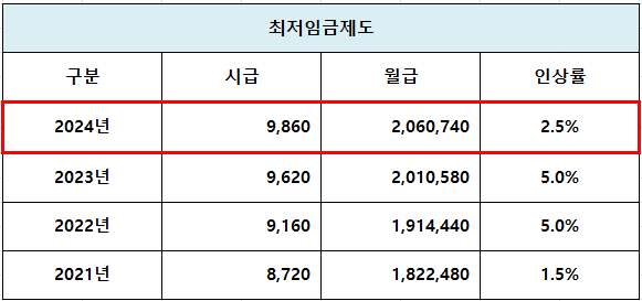 참고로 209시간 기준 월급은 2,060,740원이 되며 기존 2023년 월급여액에서 최소 50,160원이 인상된 금액을 지급해야 합니다.