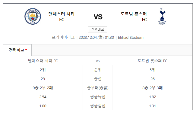 - 경기일정 : 맨체스터 시티 VS 토트넘 홋스퍼