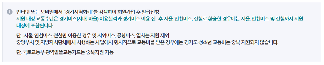 ※ 13세 또는 휴대폰이 없거나 지역화폐 App을 설치할 수 없는 휴대폰을 이용하는 청소년의 경우에는 대리인 (해당 지역의 지역화폐를 소유한 자) 지역화폐로 신청가능반응형경기도 청소년 교통비 신청시 주의사항 알아보기