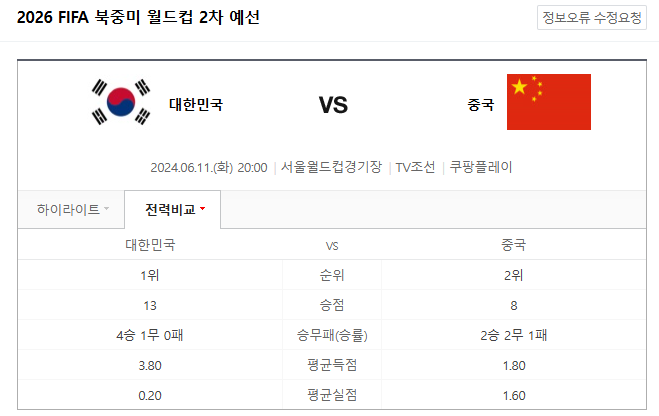 대한민국은 11일 오후 8시 서울월드컵경기장에서 중국을 상대로 2026 국제축구연맹(FIFA) 북중미 월드컵 아시아 2차 예선 C조 조별리그 마지막 경기를 치릅니다.