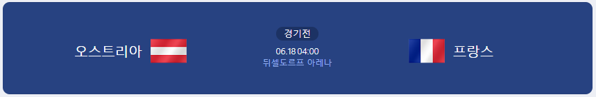 한국시각으로 24년 06월 18일 새벽 4시 우승후보 프랑스와 오스트리아와의 유로2024 D조 1차전 경기가 독일 뒤셀도르프 아레나에서 열릴 예정입니다. D조는 폴란드, 네덜란드, 오스트리아, 프랑스가 속해 있으며 죽음의 조라고도 볼 수 있을 만큼 강력한 팀들이 모여있기 때문에 조별리그 통과가 쉽지 않을 것으로 예상됩니다.