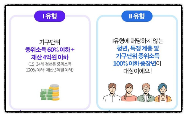 반면 2유형은 소득과 재산 요건이 다소 완화되어 있습니다.