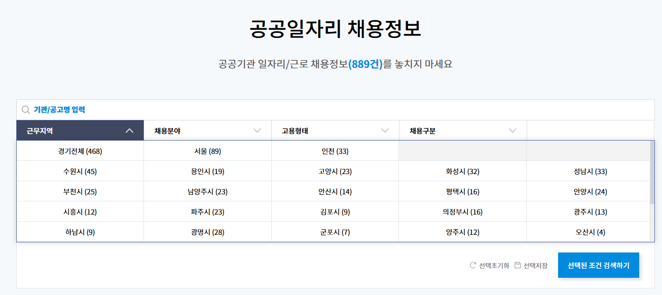 전국 주요 지자체의 공공근로 모집 현황입니다.
